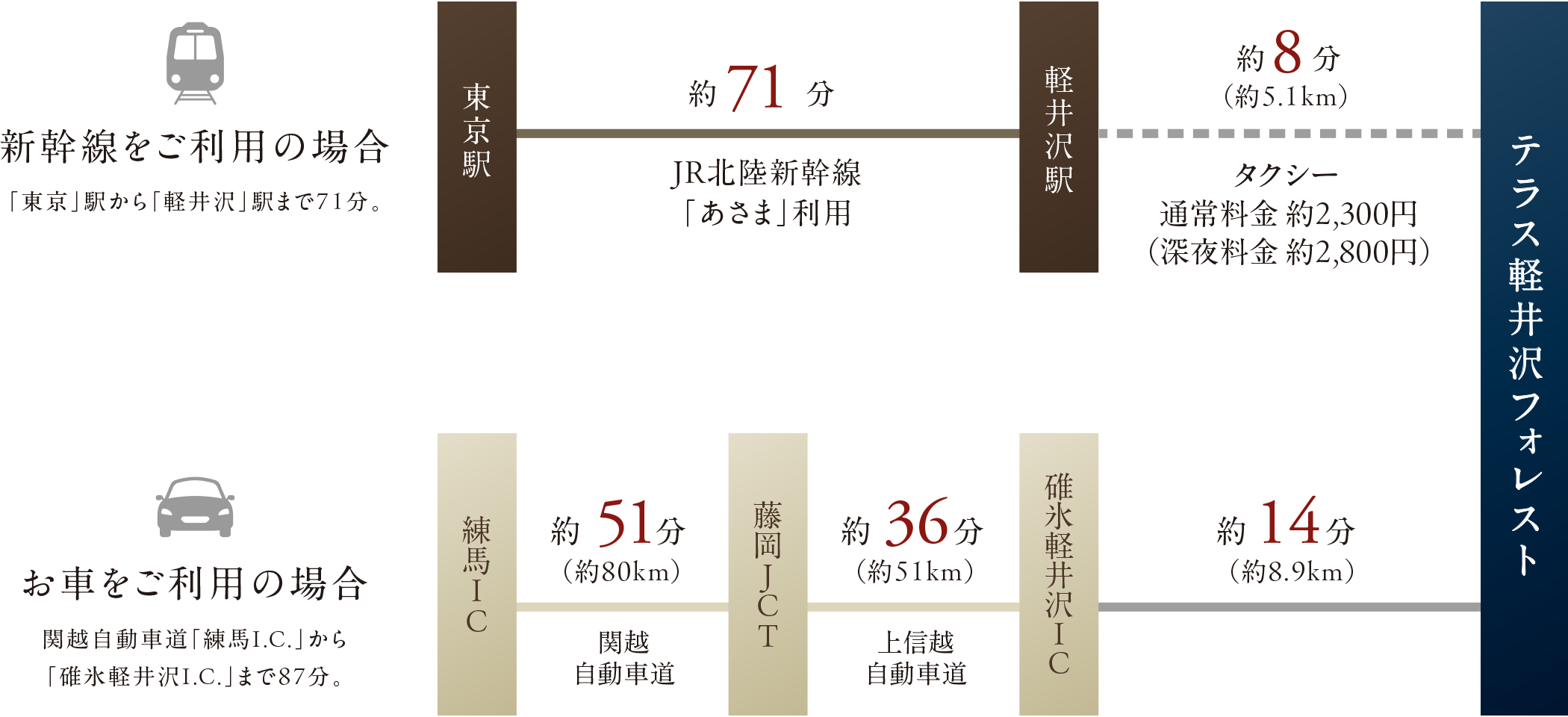 ※表示距離は地図上で概算測定したもので実際とは異なる場合があります。※新幹線の表示分数分数は日中平常時のもので、時間帯等により異なります。東京駅から軽井沢駅の分数表記は、「駅すぱあと」2024年7月版参照。